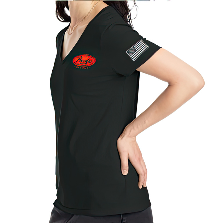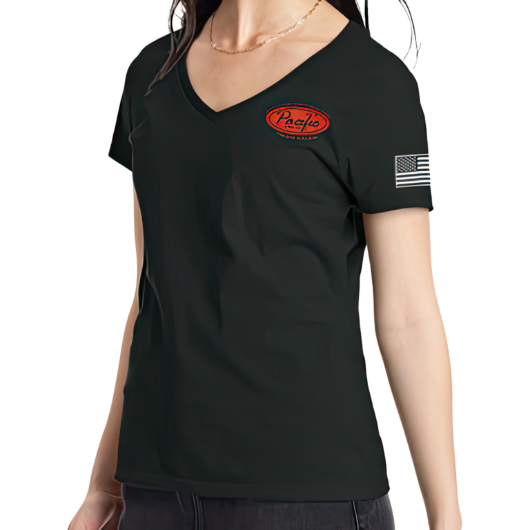 Women’s black Haines Pacific Trux shirt – this black short sleeved t-shirt has a small, breast pocket version of our logo and a large one across the shoulders and an American flag on the left sleeve.